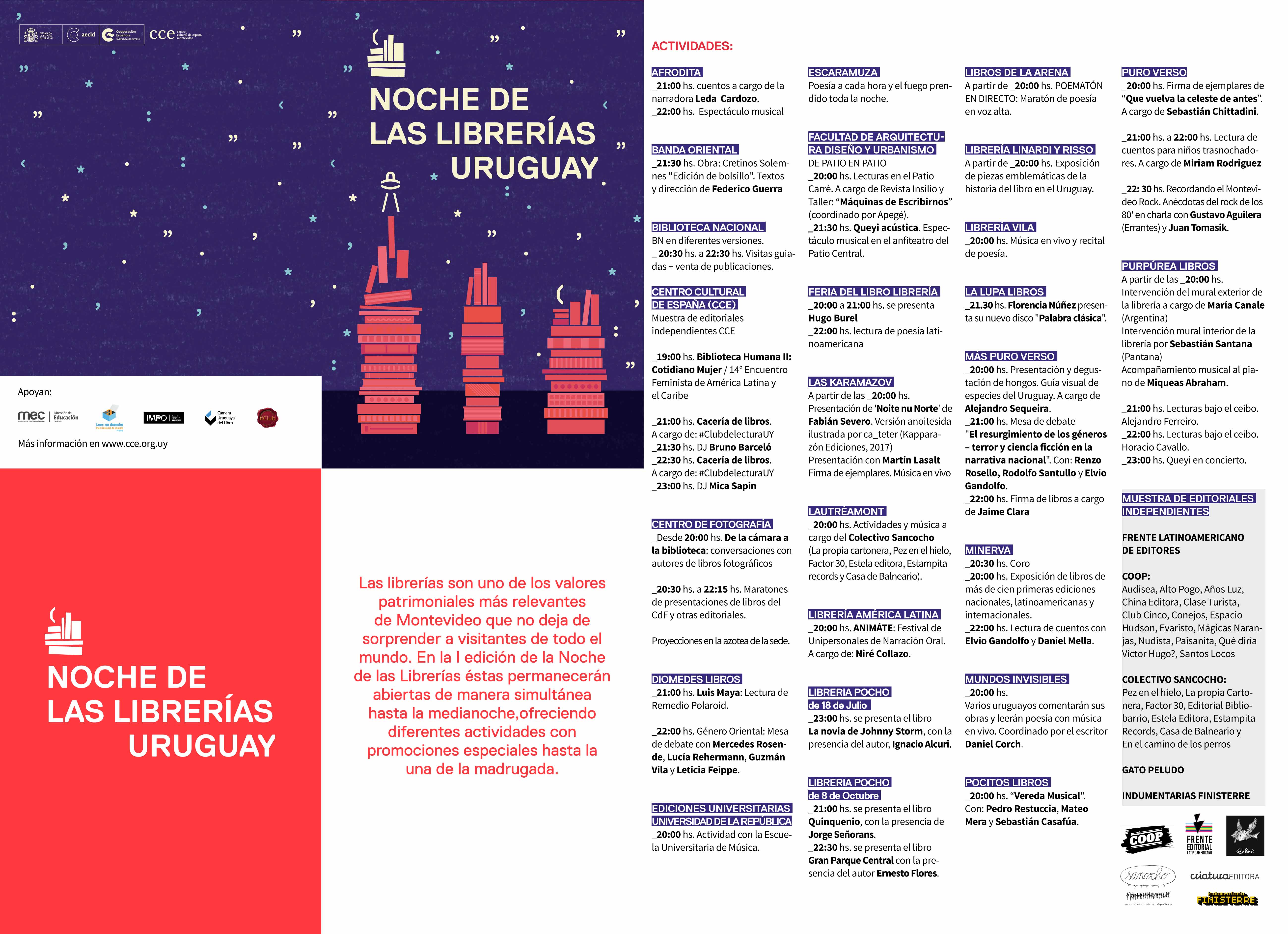 El Centro Cultural de España convoca al sector librero y editorial de la ciudad de Montevideo para impulsar una primera edición piloto de la Noche de las Librerías. Se trata de una noche en el que las librerías permanecerán abiertas de manera simultánea hasta la una de la madrugada, ofreciendo diferentes actividades y promociones.