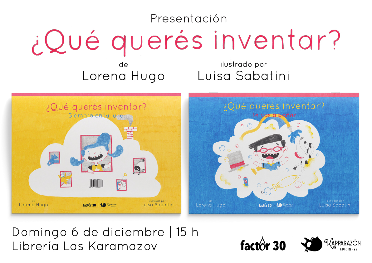 ¿Qué querés inventar? Lorena Hugo y Luisa Sabatini, Montevideo, Factor 30 y Kapparazón Ediciones, 2020. **** Lanzamiento el domingo 6 de diciembre, a las 15 horas, en Rivera 2670 (esq. Soca) ¡Lectura interactiva, galletitas, música por Mariano González y pompas de jabón!